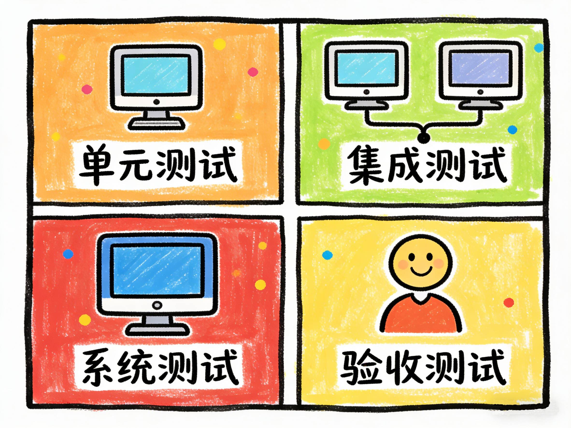 软件测试一般按照从局部到整体、从技术到业务的渐进顺序,分为以下四个阶段: