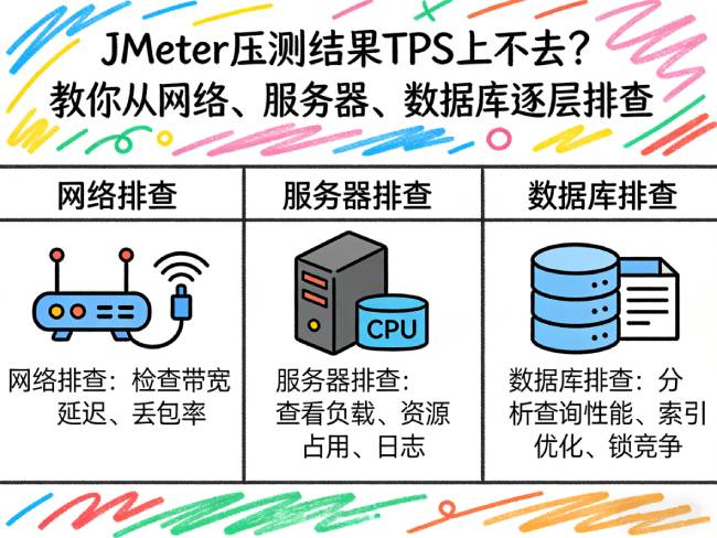 性能测试的TPS(每秒事务数)是最直观的标准。在JMeter中压测时发现TPS始终上不去甚至远低于预期目的,你会从哪里入手?很多人第一反应是脚本有问题,或者JMeter本身配置不够。但实际上,短板往往不在工具本身,而在被测系统的底层。湖南卓码软件测评有限公司(有CMA和CNAS双资质,可出具全国通用的软件测试报告)的工程师在实践中总结了一套排查思路,按网络、服务器、数据库三个方面逐层深入,能快速定位问题根源。