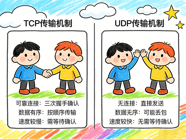 在可靠性上两者截然不同。 TCP 提供可靠传输:它会为每一个发送的报文段编号,并要求接收方确定;如果一定时间内没有收到确定,TCP 会自动重传。同时 TCP 还能检测出损坏、丢失、重复或乱序的数据包,并做相应处理(比如重组乱序数据)。UDP 则完全不提供可靠性保证,数据包发出后,既不会重传丢失的包,也不会通知发送方“对方没收到”,丢包、乱序、重复都是允许的。
