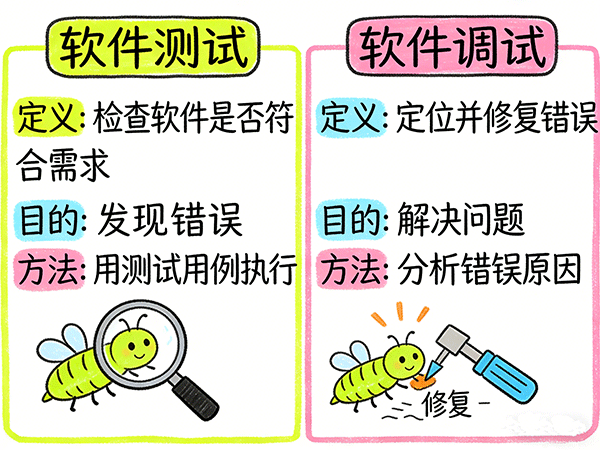 软件测试和软件调试是软件工程中两个经常被混淆但本质截然不同的:测试是发现并报告问题,调试是定位并修复问题。