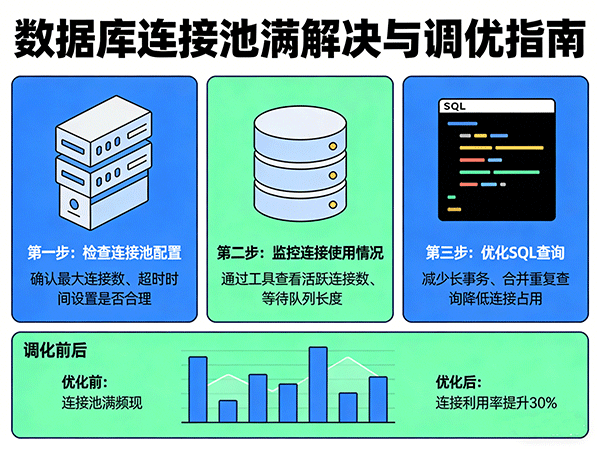 连接池满的根本原因一般有三类:约四成是连接泄漏,代码未正确释放连接;约三成五是慢SQL或长事务,连接被长时间占用;其余是配置不当,池大小过小或数据库侧限制过低。调优需从配置、代码、监控三个方面协同入手。
