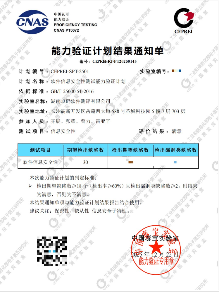 2025年9月,湖南卓码软件测评有限公司(以下简称“卓码测评”)参加了由中国赛宝实验室组织实施的CEPREI-SPT-2501“软件信息安全性测试”能力验证计划。12月22日,能力验证计划结果报告发布:湖南卓码软件测评有限公司的软件信息安全性测试能力排名软件测试机构的前20%,经技术委员会专家最终审定,评价结果为满意,顺利通过软件信息安全性测试能力验证。