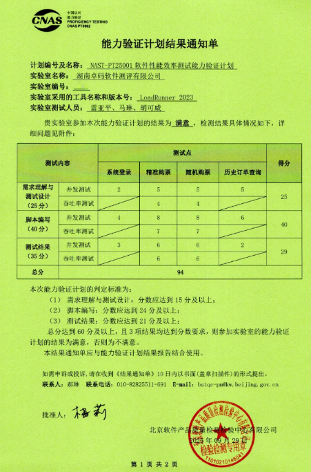 2025年9月29日,湖南卓码软件测评有限公司(以下简称“卓码测评”)传来捷报,在北京软件产品质量检测检验中心有限公司组织实施的NAST-PT25001软件性能效率测试能力验证计划中,凭借专业的技术实力与严谨的测试流程,获得“满意”评价结果,充分彰显了卓码测评在软件性能测试领域的过硬能力与行业认可度。