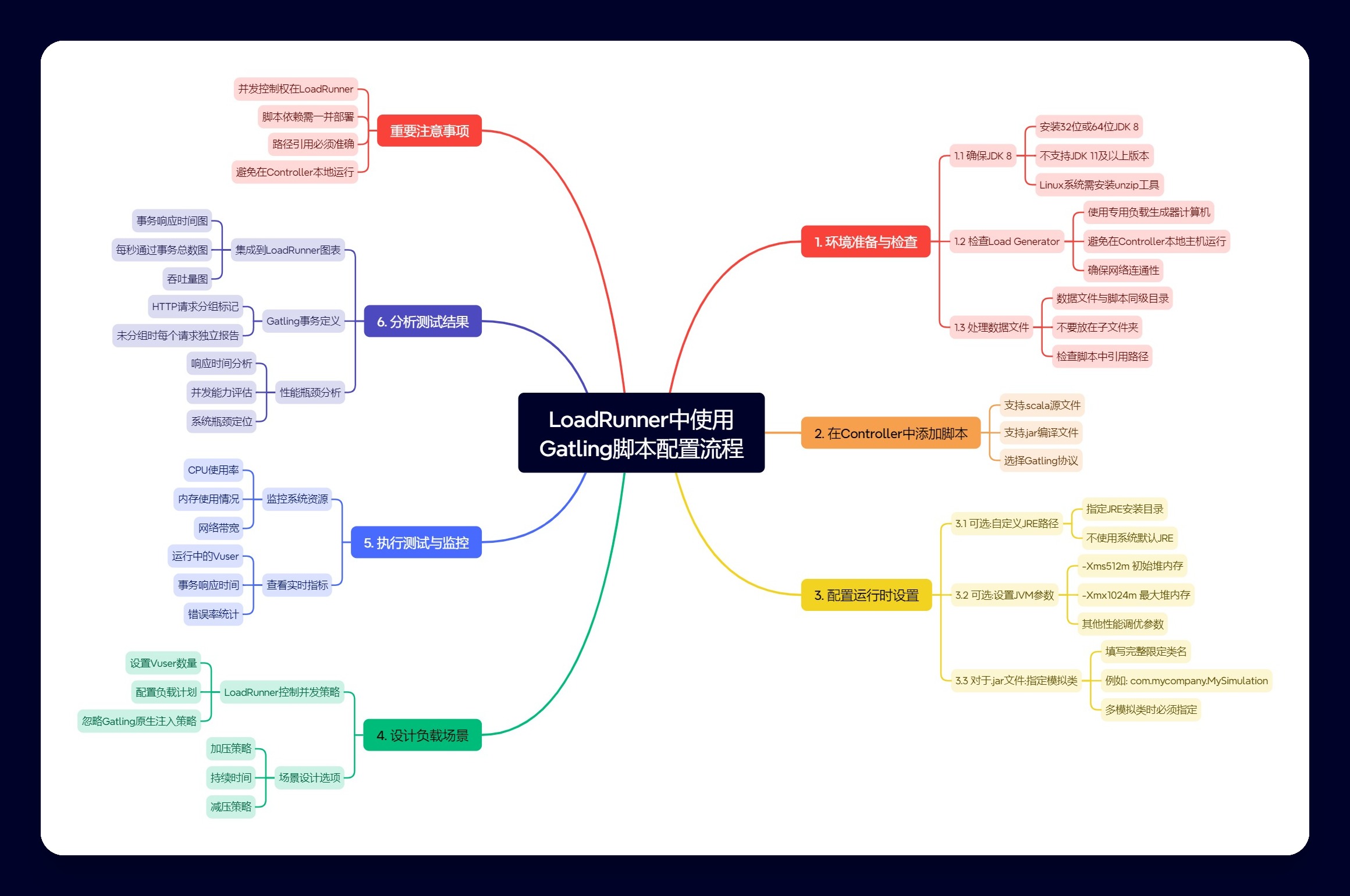 在LoadRunner中集成Gatling脚本,可以结合Gatling脚本的高性能处理能力和LoadRunner的场景控制和结果分析优势。为了清晰地指导完成整个流程,下面这张思维导图汇总了主要的配置和使用步骤: